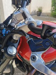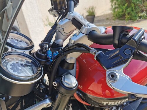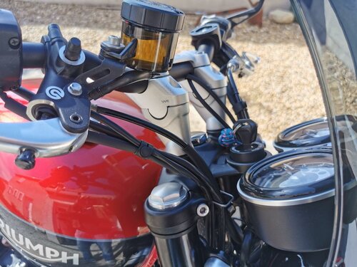 12. Je viens de monter les réhausses de pontet. Côté droit aucun souci durite de frein et gaine élec OK. A gauche câble embraye plus tendu mais en braquant à fond à droite, pas de souci particulier toujours de la garde à la poignée. Gaine élec OK Il y a encore un peu de mou au niveau des câbles des poignées chauffantes Au niveau conduite du changement, plus droit moins de sollicitations au niveau des cervicales. Meilleure visibilité au niveau des rétroviseurs.