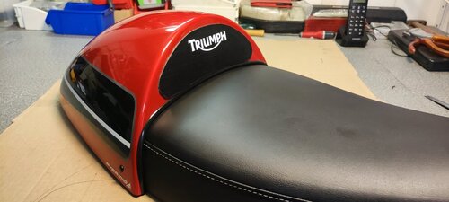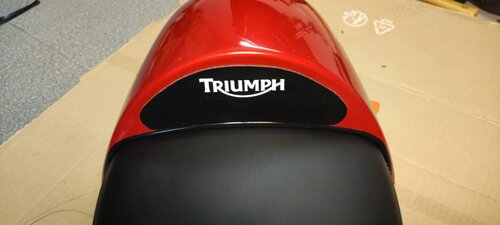 Vous avez fini par me donner des idées ! Voici ce que j'ai fait à partir de récup trouvée dans ma cave. Tout d'abord, un reste de jonc de bulle de carénage posé entre le capot et la selle pour éviter le frottement. Ensuite à partir d'une chute de vinyle, j'ai réalisé une petite 'mousse' de dosseret fixée avec du double face. Un petit autocollant Triumph par dessus et hop ! -
