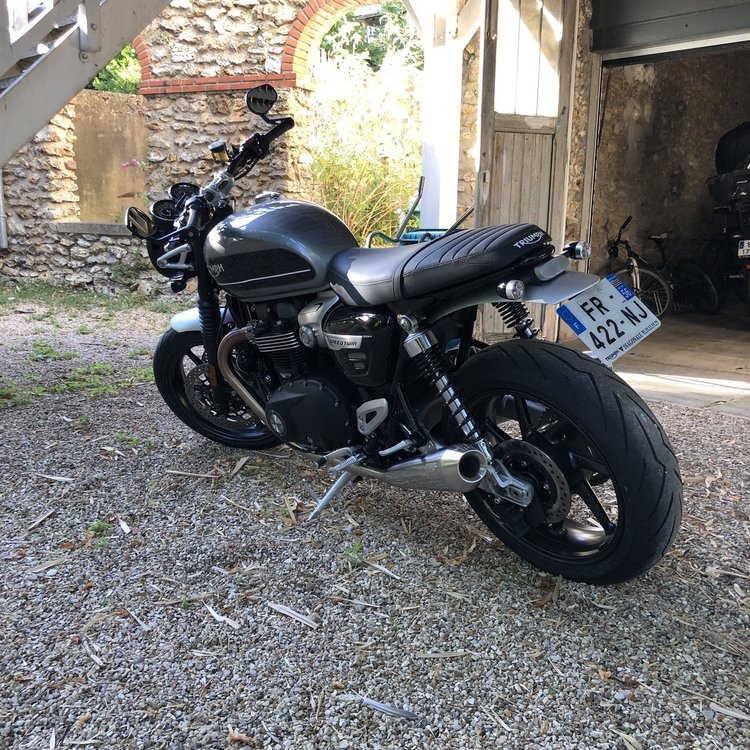 Merci ? J'aurais en effet trouvé dommage de mettre des V&H noirs alors que ce sont de magnifiques mièces d'orfèvrerie en version brossée. J'aime bien mon support de plaque et mes clignos (ils font aussi feu stop, c'est marrant même si je ne peux pas en profiter quand je roule!). Je vais aller voir si Dafy fait toujours des plaques un peu plus petites, qui restent "acceptables" pour les forces de l'ordre. Celles de chez Triumph sont vraiment trop énormes et je n'ai pas besoin de leur numéro de téléphone aux fesses. Concernant le 1200 RS, c'est une très bonne moto au quotidien pour ce que j'en attends. La position est un peu sportive et peut fatiguer les dos fragiles comme le mien mais dans cette catégorie il n'y a plus grand chose sur le marché. Je sors d'un CBF 1000 et le 1200 RS c'est un autre monde en termes de qualité de fabrication, de finitions, d'électronique, d'amortissement... et de prix! J'ai touché le mien à 13,000€ avec 8,500 km et 18 mois. J'ai un Akra pas très joli (mieux que l'origine mais gros comme l'origine) mais qui claque sa race, un shifter pro. Le shifter c'est top mais il faut s'habituer un peu... et ne pas oublier de débrayer quand on prend une autre moto! Il y a 3 modes comme sur le Speed Twin, plus un mode User que je n'ai jamais utilisé. En mode Dynamic, ça tire bien sur les bras et il faut un revêtement de qualité. On a quand même 125 CV et 125 Nm entre les cuisses et ça se sent. Les valeurs sont plus élevées que le Speed Twin (97 CV et 112 Nm) mais atteintes plus haut en régime moteur. En rythme de croisière (et je n'ai pas de régulateur), c'est un avion, Il y a tellement de couple qu'on ne change pas trop les rapports si on à la flemme. Je roule 6ème à 50/60 et elle repart. Le Speed Twin aussi j'ai l'impression. J'ai mis un assez gros top case car le BMW d'orgine est vraiment trop petit. Le cardan m'évite la corvée du nettoyage/graissage de chaîne (je roule aussi quand il pleut!). Le freinage et l'amortissement sont vraiment diaboliques. Mon Speed aura du mal à s'aligner, en tout cas sans investir dans des ressorts de fourche et des amortisseurs, ce que je ne suis pas sûr de faire tout de suite. Le poids est un peu élevé à 236 kg, 40 de plus que la Speed Twin. On le sent en statique mais une fois lancé, ce n'est vraiment pas un sujet. Voilà, tout ça pour dire que, au quotidien, j'aime bien mon 1200 RS ? -