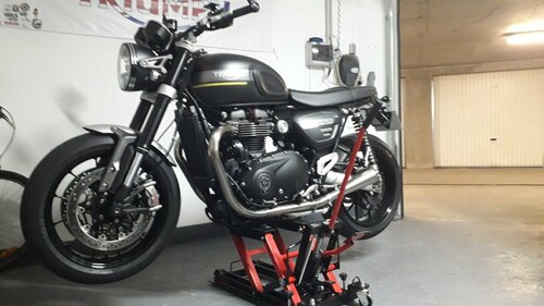 J'ai arrêté avec les béquilles d'atelier. Je me suis payé pour le prix de deux béquilles mon lève moto. Je présente le LM au ras de la latérale, je monte sur ma bécane, j'ôte la latérale et avec mon pied gauche je tire le LM sous la bécane et ensuite j'actionne la pédale en étant tjrs dessus. Dès quelle est stable je descends et continue de la lever jusqu'à 30 cm. Pour la descente je procède rigoureusement de manière inverse. Petit bémol j'ai du faire installer un sabot moteur pour avoir un bon appui. Photo de mon bobber car je n'en ai pas fait avec le ST