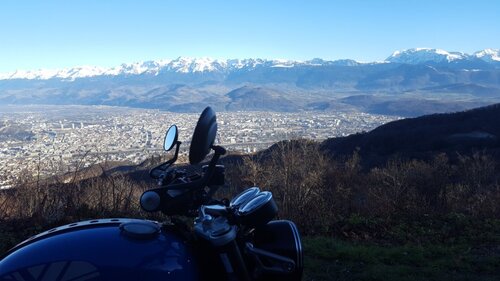 Petite sortie cet aprèm dans le Vercors. Çà pèle quand même... Heureusement ce bon moteur de ST sert de radiateur au niveau des gambettes et les poignées chauffantes font le reste... En bas ma ville : Grenoble et en fond la chaine de Belledonne