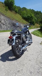 Je voulais revenir à la 900 Street Scrambler car, bien qu' ayant le même poids, je la trouve plus maniable surtout sur les routes forestières d'autant plus si elles ne sont pas goudronnées. Cette SS 900 freine super bien par rapport aux autres modèles de chez Triumph (hormis celles équipées des M50). Un très bon couple et avec un V&H que demander de plus à 70 palets. Je reviens de ballade dans le Vercors, elle est quand même extra cette Speed Twin à part ce moulin qui chauffe, mais qui chauffe... De quoi effacer, quand on rentre à la maison, tout le plaisir de la journée. En rentrant je trouve sur mon mail l'offre de ma concess : montant de la reprise 9000€ pour une bécane qui me revient à 17000 et il faut que je rajoute de 3100€ pour avoir la SS Goldline sans compter toutes mes options... J'hésite quand même à vendre à un particulier autour des 10000 et racheter une SS euro4 qui me permettrai d'installer un pot V&H interdit sur les Euro5. La nuit ou les nuits porteront conseil. Je vais me dépêcher d'attendre... -