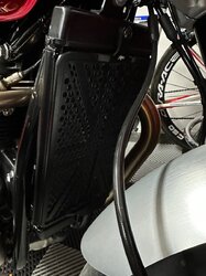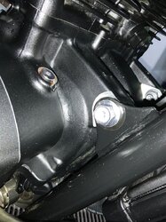 Bonjour, Suite des modifications sur ma belle rouge . Remplacement de la visserie d’origine des carters moteurs par la noire. Pose de la virole de phare en alu usiner Manque plus que la barre de maintien Renntec à la place du porte paquet et les Ohlins qui devraient arriver début Avril .
