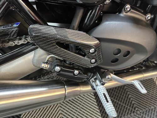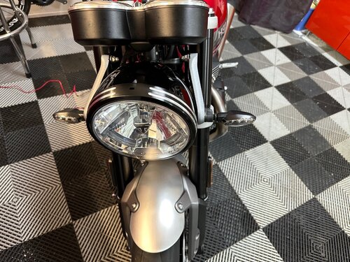 Bonjour, Commander fin décembre, elle devait arrivée début avril mais finalement elle est arrivée en avance . Donc, je l’ai ramener ce matin , mon anniversaire étant dans un mois c’est un magnifique Cadeau. Je l’ai équipée d’un porte paquet Hepco pour que Mon épouse puisse se tenir sans risque. J’ai fait monter dessus par ma concession, les capteurs de pression ainsi que les diabolos. J’attend pour début avril une paire d’Ohlins pour remplacer les amortisseurs arrière. Autrement dès cet après-midi avec l’aide de mon fils l’on a commencé certaines modifications. - Montage support de plaque court - Fond de compteurs Arton - Protège chaîne en Carbon - Protège talon en carbon - Support Antivol et Antivol Triumph - Grille de protection radiateur Union Jack - Stickers catadioptres made in Arnaud Daburon La suite des modifications seront les suivantes dès que j’aurai reçu les pièces - caches injection en carbon - Virole de phare en alu, - Visserie noire des carters moteurs - visserie alu anodisé en remplacement de certaines vis peut-être un saute vent mais pas sur et si un jour je trouve une barre de maintien , je remplacerai le porte paquet malgré que je trouve qu’il ne dénature pas trop la ligne de la moto. Cordialement Emile