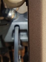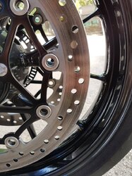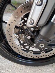 Quand je pense que c'est comme cela depuis quelle ma été livré je passe une cale de 0,15 mn entre l'étrier et le disque de frein, la tolérance du voile d'un disque autour de 0,08 mn en prenant en compte la déformation lors des freinages et la dilatation du à la température ça frotte, je pense que Triumph va faire le canard . Ho sans dec ya pas photo -