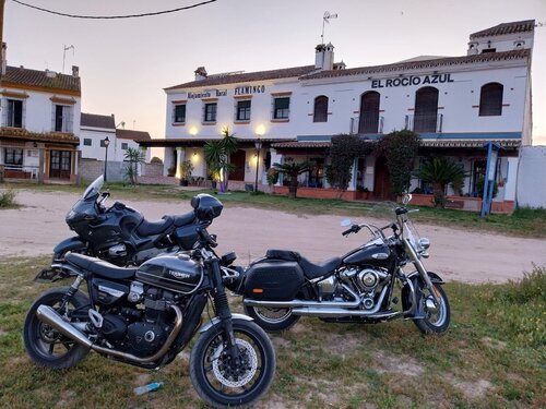 Avec 2 potes et ma ST, la dernière semaine d'Avril nous avons fait une petite boucle de 3500km. En passant par les Pyrénées centrales nous avons rejoint le Nord du Portugal. D'abord Bragance pour commencer la N2 de Chaves jusqu'à Faro. Puis ensuite un petit détour en Andalousie pour séjourner dans le magnifique site d'El Rocio. Malheureusement pas le temps de rester, nous étions à proximité de Jerez de la Frontera juste avant le début du moto GP avec le podium de Fabio Quartararo. Nous avons croisé en sens inverse un nombre impressionnant de bécanes. Retour par le centre de l'Espagne. Pour la météo à l'aller nous avons eu la route dégagée pour le tunel de Vielha mais de la neige sur les côtés à la sortie. Un peu de pluie avant l'arrivée et en entrant au Portugal. Ensuite beau temps puis chaud sur le reste du trajet jusqu'avant le tunel de Vielha pour recevoir un orage de grêle au retour. Mais grand plaisir du début à la fin, nous avons toujours super bien mangé... et bu (sans modération, le soir bien entendu ). Au Portugal nous avons suivi des routes vallonnées sinueuses à souhait et rencontré des gens vraiment très accueillants (avec un petit contraste: bien plus beau et sympa dans la moitié Nord que dans le Sud. Mais attention pas la peine d'entamer un sujet dessus sinon ce sera comme les couleurs de nos ST ça va commenter pendant 10 ans au moins; Parole de sudiste habitant en région parisienne). Grande joie aujourd'hui pour la magnifique victoire de Johan Zarco au Mans, et je regrette bien de ne pas avoir pu y aller cette année. Quelle ambiance il devait y avoir pour les chanceux qui étaient présents !