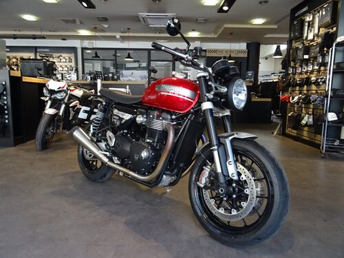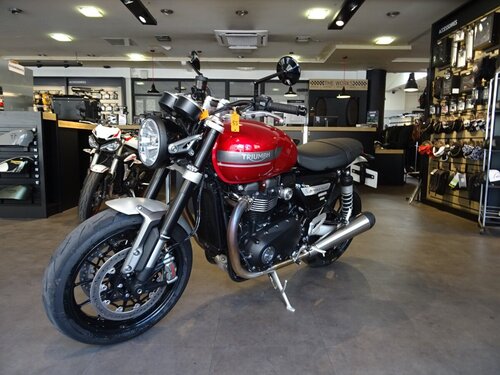 Salut à tous, je vous présente ma nouvelle monture une speed twin de 2022 en rouge (je devais partir sur le jet black mais pas trouvé) totalisant 3350 kms. je suis allé la chercher chez triumph nice samedi dernier et l ai conduite de retour principalement sur l Autoroute (220kms) j ai déjà rajouter la grille du radiateur et les embouts de valve anodisée. A venir je prévois de rajouter : - virole de phare alu - sabot moteur - plaque court arrière - refaire ou changer la selle ( trop inconfortable sur trajet long) a bientôt