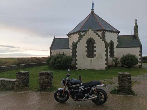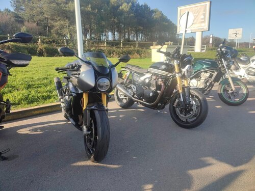 Oui , route mouillée je viens de faire les quelques kms puis coup de jet d'eau shampoing et premier graissage de chaine , il me reste 60 kms pour atteindre les 1000 kms , c'est la distance qui me sépare de Triumph pour la révision samedi . Demain flotte , la RS reste au garage . Pour chasseurd : C'est que du bonheur , confortable en duo ou seul .Aucune lourdeur .suspensions rien à dire Maniabilité basse ou haute vitesse Poignées chauffantes utile en ce moment .Je met le régulateur de temps en temps (facile à utiliser ) Je suis toujours en dessous de 5 litres au 100 kms en mode pluie et ça répond et ça pousse Je n'ai pas testé les autres modes vu que le mode pluie me comble déjà ! Je dois avoir peur d'essayer les autres On verra après les 1600 kms et route sèche/ température adaptée . Comme je l'ai déjà dis si je devais refaire le choix entre standard et RS , ce serait RS Concernant les pneus ,je n'ai pas eu la moindre mésaventure , j'ai roulé par -4 , et pas mal par 3-4 ° . Sur route mouillée je suis prudent , on est à l'abri de rien mais pas de soucis en rond point . -
