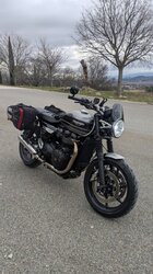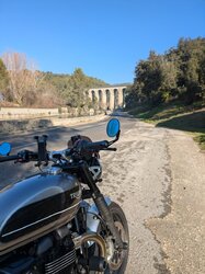 Bonjour à tous, Après avoir longtemps bavé sur la speed twin et farfouillé sur le forum pour m'enrichir de vos connaissances sur la belle, j'ai sauté de pas début décembre. Je suis de Nîmes et j'ai 41 ans, le permis moto depuis 2018 seulement. J'ai fait mes armes sur un fazer 600 bridé à 34cv avant de passer sur une Kawasaki Vulcan S (typée custom) une fois la passerelle passée. Je n'ai aucunement la prétention d'être un pilote et j'apprends encore à chaque sortie. Étant assez petit (1m65), je cherchais une moto accessible tout en retrouvant une position plus dynamique que sur un custom. Je reprochait à la kawa un manque cruel de couple surtout en duo. Au final j'avais établi une short list de quelques modèles : nine T, scrambler 1100, Diavel 1ere version, T120 et bien sûr la speed twin 1200. J'ai pu essayer la plupart d'entre elles et la speedtwin est apparue comme le meilleur compromis à tous mes critères en plus d'être esthétiquement ma préférée. Ayant essayé un modèle d'essai (2024) sur une route bien bosselée mes seuls "reproches" ont été la suspension arrière et le freinage avant pour moi trop incisif (même si je suis sûr que c'est une question d'habitude). J'ai finalement opté pour un modèle de 2019, qui je trouve est le plus beau avec un vrai look rétro comme j'aime et un freinage facilement dosable. A la lecture du forum je me suis rendu compte que c'était l'ancienne monture d'un membre, Tuffgong pour ne pas le nommer. La moto est suréquipée de petits détails plus des amortisseurs shock Factory à l'arrière et un kit fourche bitubo. Je suis littéralement amoureux de cette machine, qui me comble aussi bien en statique qu'à son guidon où elle contente largement mes capacités de pilotage. Je reviens d'un petit trip glacial dans le Luberon...un régal Je suis très heureux de rejoindre la communauté et au plaisir de vous croiser sur les routes ✌