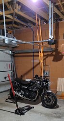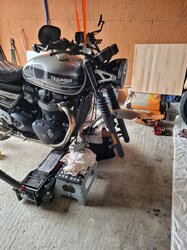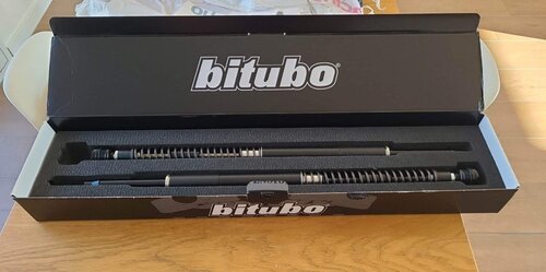 7. Après les shock Factory à l'arrière j'ai jeté mon dévolu sur un kit fourche bitubo. Pourquoi bitubo? Parce que je préfère la couleur des bouchons à ceux d'andreani En réalité je pense que la performance de ces 2 kits sont identiques, à prix également identique et suffisant pour mon niveau. Le fait également de remplir la fourche d'une quantité d'huile définie par le constructeur sans ce prendre la tête à respecter une hauteur a également fait pencher la balance. Commandé en Italie chez omniaracing pour 565 euros fdp in mais huile non incluse. Délai de livraison 4 semaines Je vais pas faire ici un tuto. Celui dispo sur le forum pour le kit emc est très bien fait. Je me suis également appuyé sur une vidéo de l'installation de ce kit sur une bonneville et une sur l'installation du kit nitron sur une speed twin. Bref j'étais confiant. Je cale la moto Tout se passait bien jusqu'à cette fameuse vis du bas qui tient le plongeur de la fourche et dont il était également question dans le sujet sur le kit emc Impossible à dévisser. Elle tourne dans le vide. J'essaie de bloquer l'intérieur de la fourche avec un manche à balai (ça marche dans la vidéo sur la Bonneville ) sans succès. J'essaie de dévisser en compressant la fourche...pas mieux En lisant le manuel Triumph je vois qu'il existe un outil spécial pour bloquer cette fourche. Ça fait chier d'acheter ça pour l'utiliser une fois mais bon si ça permet de débloquer la situation. Appel au concessionnaire Triumph. Je lui explique la situation. L'outil coûte 37 euros mais il me dit de passer et il me facturera le temps passé dessus. Ok direction Triumph sachant que j'ai démonté une seule jambe car a priori c'est galère de remonter les jambes après avoir enlevé les 2 en même temps. Le mec me prend la fourche et 5 mn chrono plus tard c'est bon. Du coup c'est gratuit Il me dit que la technique est de bloquer la fourche dans un étau et tout en "l'étirant" un maximum mettre un coup de clé à choc. Ça va à l'encontre de tout ce que je lis mais ok je testerai sur la seconde jambe avec l'espoir de ne pas avoir à repasser chez Triumph. Je remonte la première jambe et j'attaque le démontage de la seconde. Et effectivement avec cette technique c'est ok en 2 mn. Clé à choc obligatoire par contre. Je ne sais pas si c'est valable pour toutes les fourches mais je sais que je viens de faire le plus dur. Il me reste demain à finir de remonter la seconde jambe, le garde boue, la roue, les étriers de freins et resserrer le tout au couple